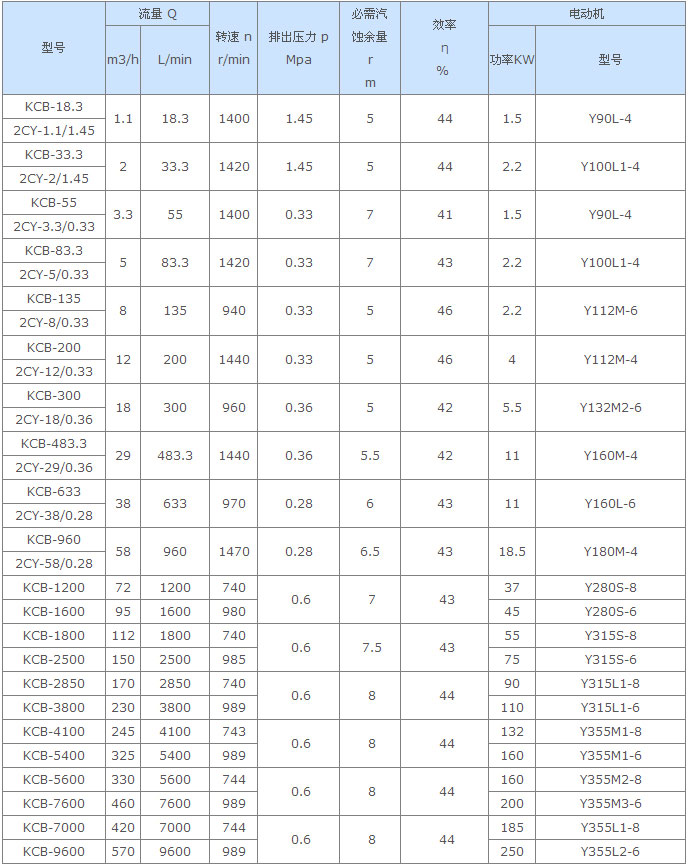 KCB型齒輪泵適用于輸送不含固體顆粒和纖維,無腐蝕性,溫度不高于80℃,粘度為5×10-6~1.5×10-3m2/s (5-1500cSt)的潤滑油或性質類似潤滑油的其他液體。