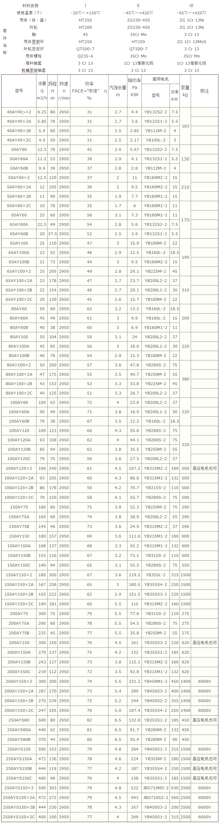 AY型單、兩級離心油泵是在老Y型離心油泵系列的基礎上進行改造并重新設計的。它是為滿足現代化建設的需要,盡快地適應以節能為中心的設備更新換代而發展的新產品。